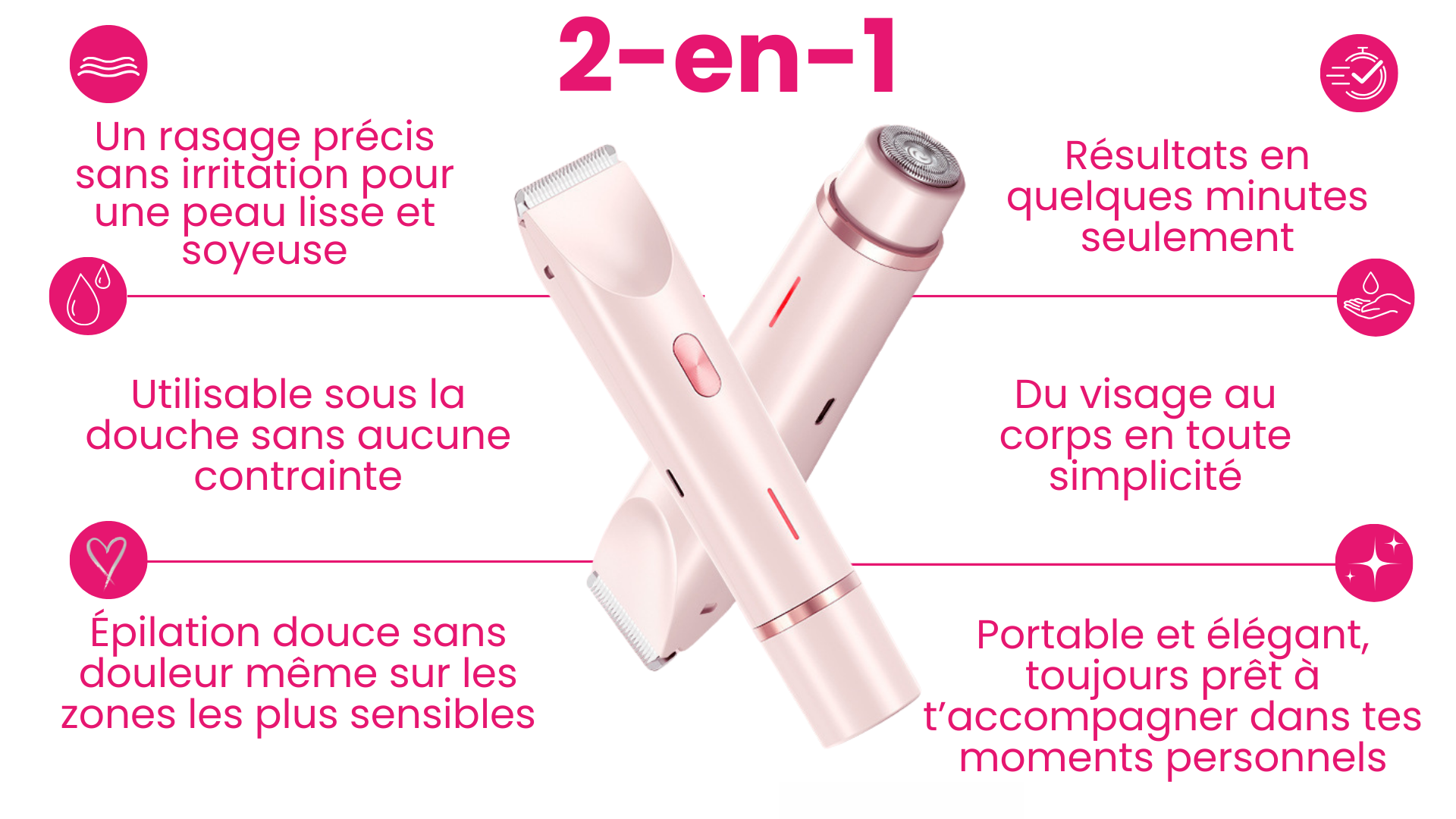 OhLisse est un rasoir électrique 2-en-1 conçu spécialement pour les femmes. Il combine une tête de rasage de précision et une tête rotative pour une peau lisse, sans irritation, coupures ou poils incarnés. Contrairement aux rasoirs jetables, il est réutilisable, écologique et doux pour toutes les zones, même sensibles.